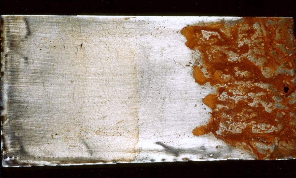 Op het linker gedeelte van de staalplaat is Waxoyl 120-4 aangebracht. Na drie maanden aan een zoutsproeitest onderworpen te zijn geweest, is het behandelde gedeelte niet geroest. Daarnaast is ook goed te zien, dat het midden wat niet behandeld is, eveneens beschermd is tegen de roest dankzij de capillaire werking van het Waxoyl 120-4 product.